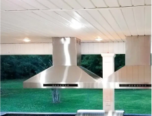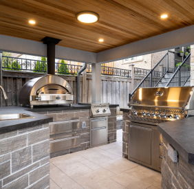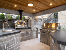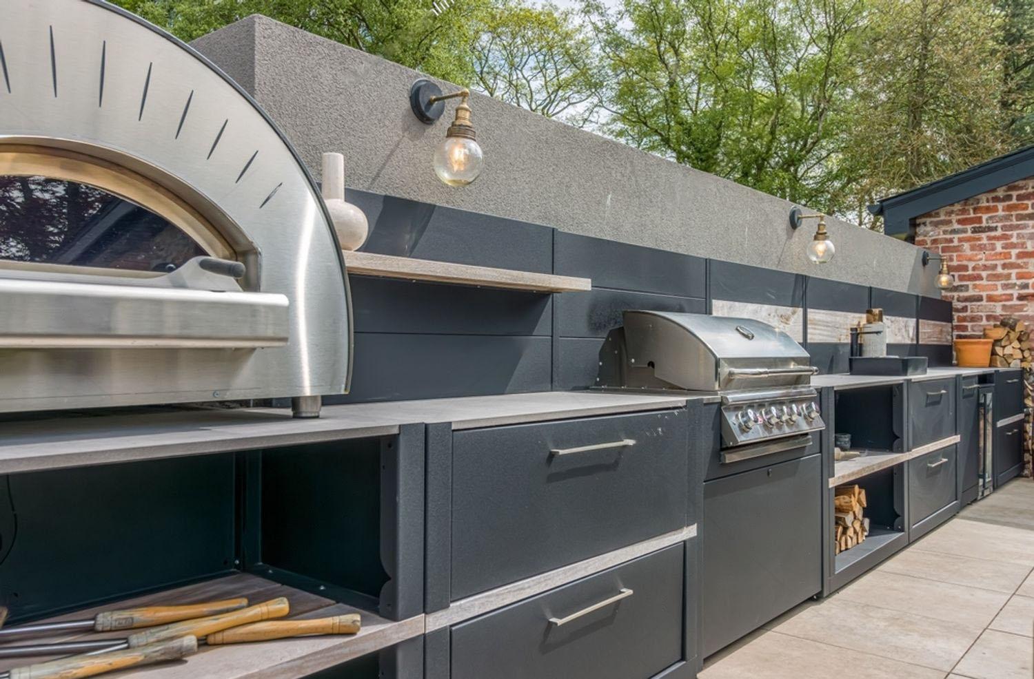 1. This project highlights a sleek and modern outdoor kitchen constructed from industrial steel, providing a contemporary and stylish cooking area. The design includes a durable concrete countertop, a built-in pizza oven, and state-of-the-art appliances.